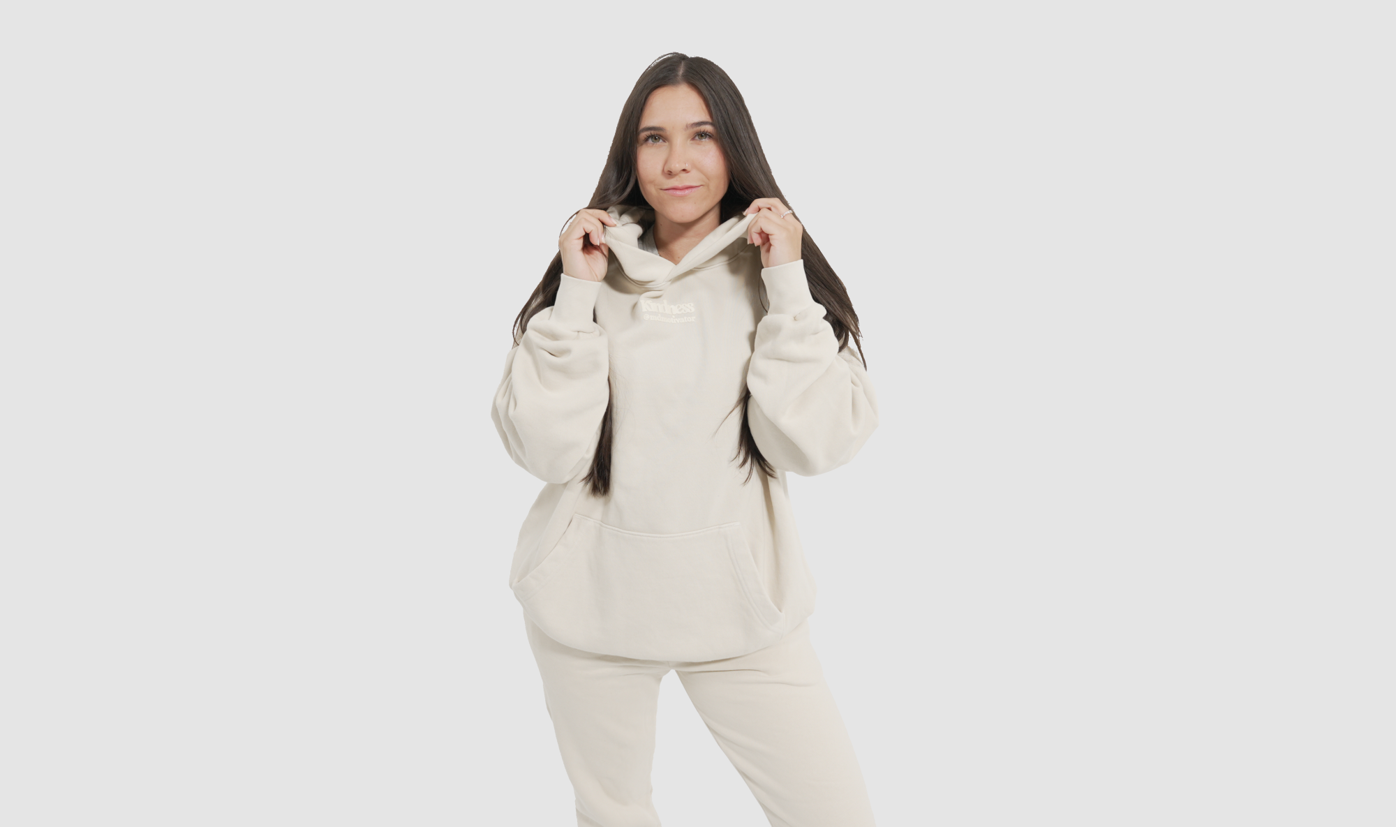 Kindness cream hooded sweater features a top centre front Kindness stamp logo, crafted from midweight cotton with a cream finish. Kindness Is Cool centre back graphic. Complete with a spacious pocket on the front and cut to a relaxed fit.